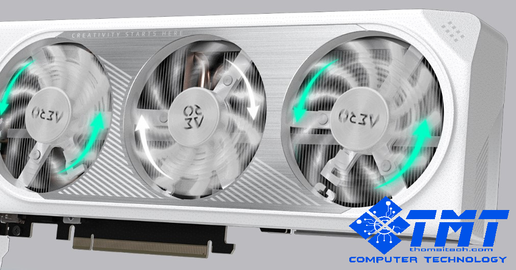 Hệ thống làm mát WINDFORCE có ba quạt cánh quạt 80mm độc đáo, quay xen kẽ với 4 ống dẫn nhiệt bằng đồng tổng hợp tiếp xúc trực tiếp với GPU cho hiệu quả tản nhiệt vượt trội.