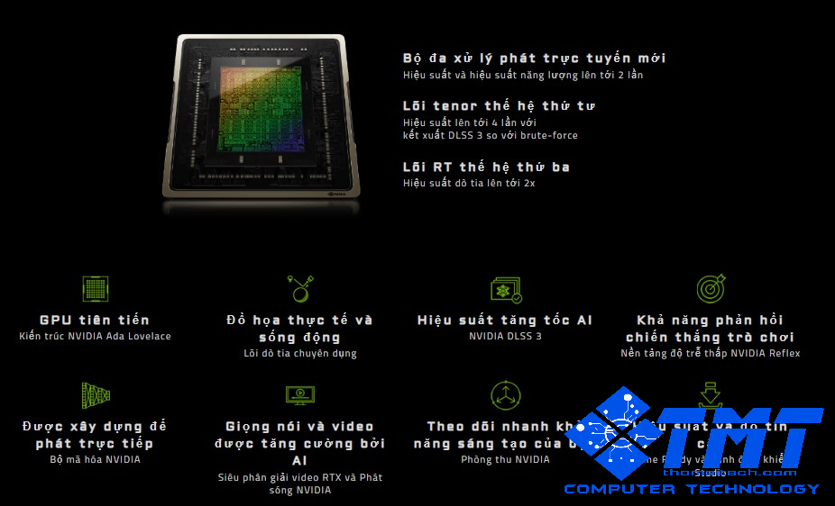 Hỗ trợ bởi NVIDIA DLSS 3 cùng lỗi Tensor thế hệ thứ 4 mang đến hiệu suất gấp 4 lần so với brute-force. Không dừng lại ở đó, dòng card màn hình với lõi RT thế hệ thứ 3 hỗ trợ hiệu suất dò tia lên tới gấp 2 lần.