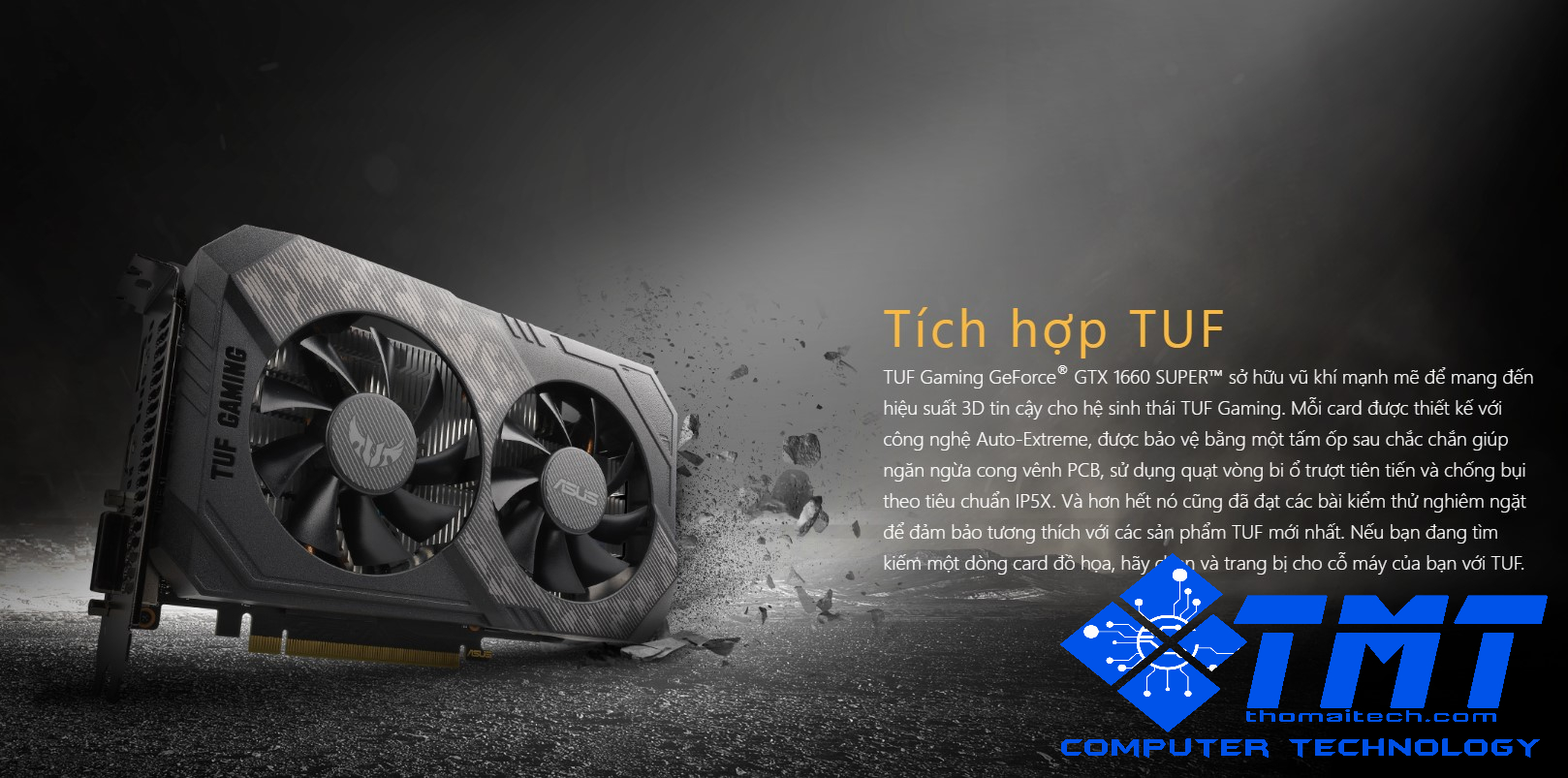 Là 1 sản phẩm thuộc dòng TUF, Card màn hình ASUS TUF GTX 1660 Super-O6G GAMING đạt tiêu chuẩn chống bụi IPX5.