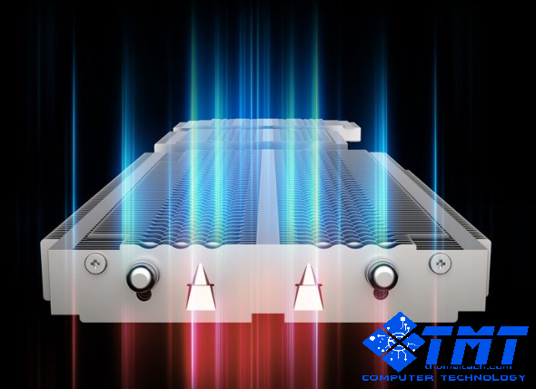 Nhiệt từ GPU và các module bộ nhớ được truyền trực tiếp sang đế tản nhiệt bằng đồng phủ niken rồi truyền qua cho các lá tản nhiệt. Thiết kế này mở rộng khu vực truyền nhiệt với hiệu suất cao tăng cường hiệu quả tản nhiệt tổng thể.